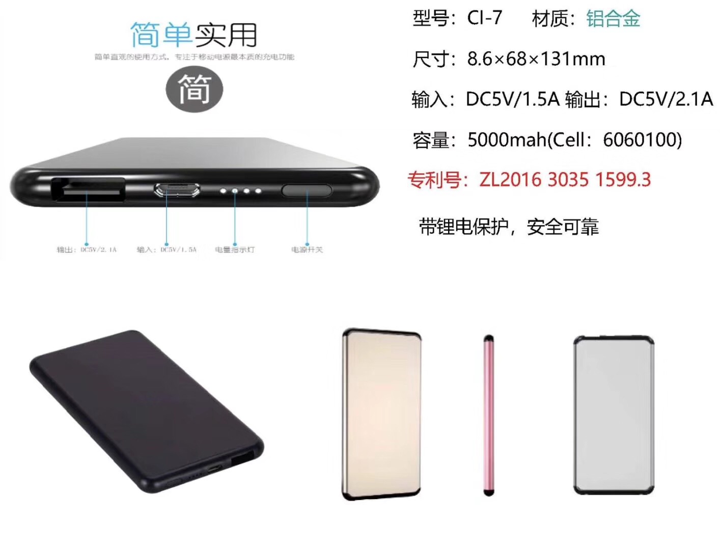 单U超薄聚合物小巧移动电源充电宝铝合金外壳(适合礼品) 超薄聚合物移动电源充电宝铝合金外壳